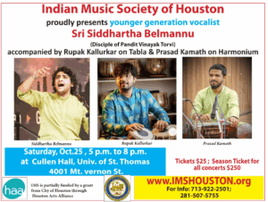 Vocal Recital: Siddhartha Belmannu ; Roopak Kallurkar (Tabla); Prasad Kamath (Harmonium);Cullen Hall, UST | October 25 (Sat) | 5PM – 8PM |